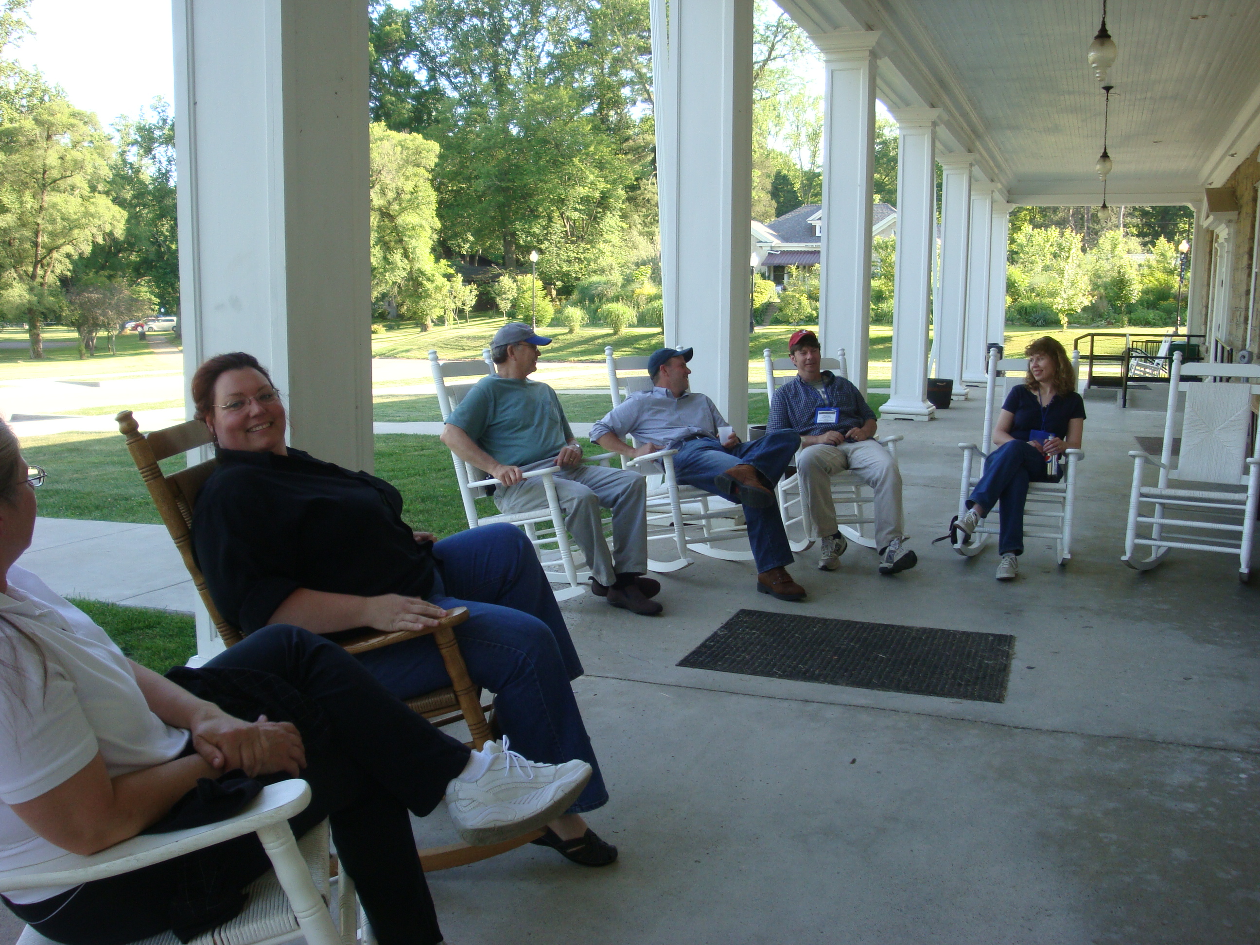 ALHFAMers quickly discovered the shade trees, many porches, wi-fi, vending machines and the comfy batch of rocking chairs on the dining hall porch. They are making good use of them. Yes-many comments about retirement planning for some.