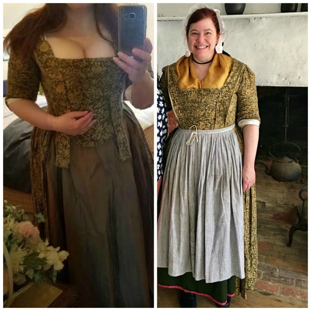 Based upon information in Sharon Burnston’s Fitting and Proper suggesting that the center-front closing style was popular later than the 1770s and that many stomacher-front gowns were altered to the later center-front closing style, I decided to alter this gown in reverse. Problem #1 was that the bodice was separate from the skirts, and I was racking my brain to figure out how, without another large panel of left-over fabric, to put the gown back to the one-piece back style. When a friend said to me “it really can’t be done,” I remained undeterred. Having seen a gown in the collection of the Newport (RI) Historical Society that was completely pieced, I decided that was the solution. I cut down the back of the neckline, cut off the point at the bottom of the bodice, pieced and pleated the back upper bodice, pieced that onto a longer piece for the middle back of the skirt and re-pleated the back in the correct manner. The piecing is visible upon close inspection. Yet from a distance, when wearing with an apron over it, it is much less noticeable, especially after it is steam pressed