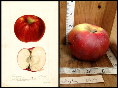 The Buckingham apple is the quintessential southern apple, valued for the size, flavor and the productiveness of the tree. Brought from Buckingham County, Virginia. About 1795, the variety moved from Virginia to Kentucky and spread into Missouri and Indiana as Queen or Kentucky Queen, while it moved west simultaneously from North Carolina into Tennessee and Illinois under the name Buckingham.