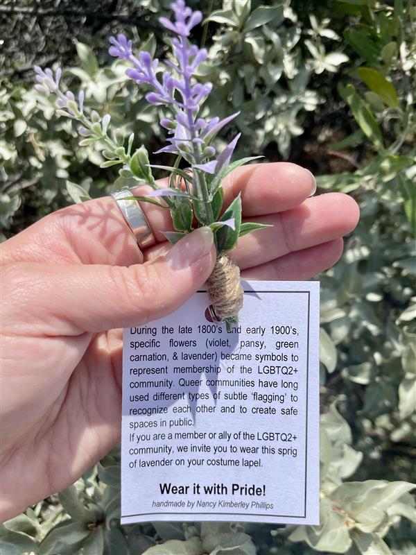 In 2023, one of our interpreters approached me and asked if they could wear a lavender sprig on their costume lapel to signal that they were part of the LGBTQ2+ community. During the Victorian Era, floriography (a way of communicating through cryptic flower messages) was popular, including among the LGBTQ2+ community. Wenzhe Li, a scholar in art history and Queer theory, writes that “some flowers, such as violets, pansies, and lavender, are considered the symbols of LGBTQ+ culture.” Violets were popularized by the writings of Sappho (c. 630-570) to symbolize specifically women-loving-women relationships. Pansies were most popular in the 1920s-30s and were also used as a term for homosexual men. Oscar Wilde became known for the use of green carnations in 1892 when he instructed his friends to wear them on their lapels as a symbol for men-loving-men.