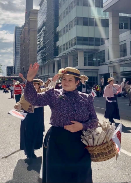 At Heritage Park, all public-facing roles wear a period-appropriate historic costume that is hand-made specifically for their area, site and role. The wearing of lavender on costume lapels fits thematically and historically with the rest of the Park; it is a tool for interpretation, and it is a way of making period-appropriate Pride pins available for the staff who want them. While it is true that people in small-town Alberta may not have historically worn these Queer flowers, being at a living history museum allows us to weave together narratives in meaningful ways that will speak to our communities in 2025. After writing a proposal and getting the necessary approvals, I initially created 80 pins made of faux lavender, a large clothing pin, wire, and twine. We attached small write-ups to each pin that explained the history and the purpose of this project, so that people could self-select if they wanted to participate.